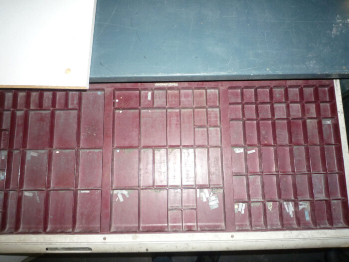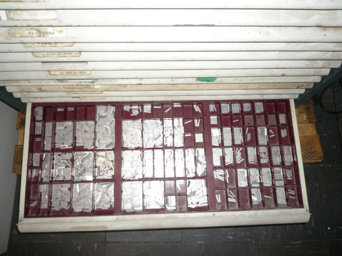 - Cabinet holds 20 trays, 1 is missing, 1 draw is empty, 18 draws with Type.